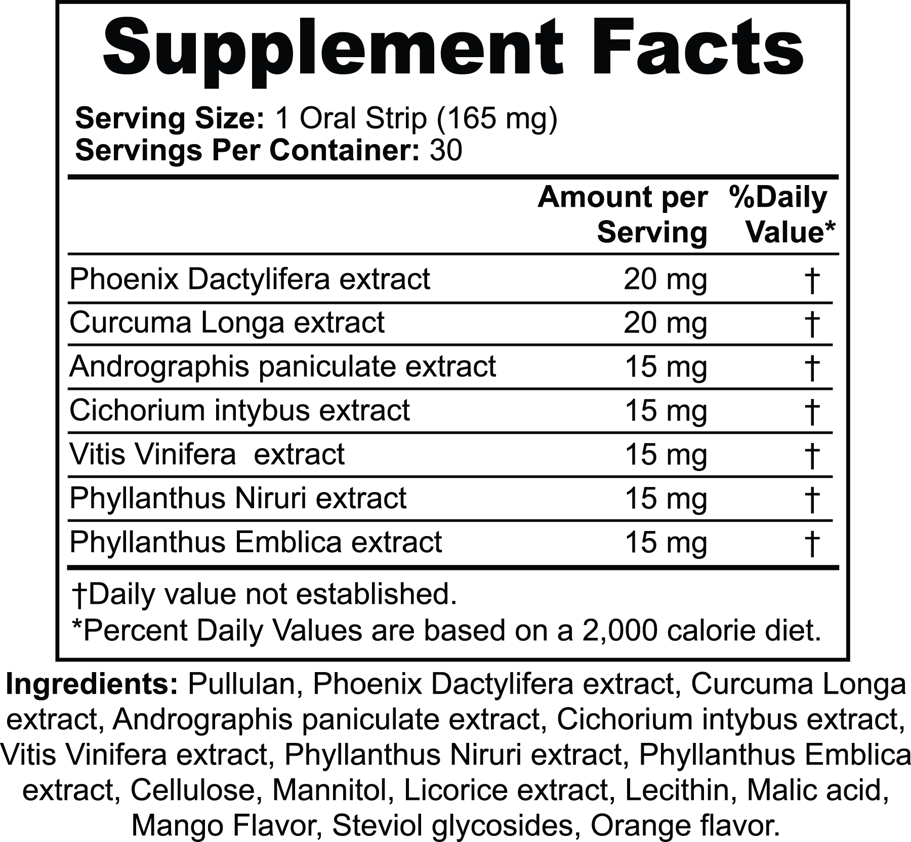 Ingredients:Â Pullulan, Pheonix Dactylifera extract, Curcuma Longa extract, Andrographis paniculate extract, Cichorium intybus extract, Vitis Vinifera extract, Phyllanthus Niruri extract, Phyllanthus Emblica extract, CEllulose, Mannitol, Licorice extract, Lecithin, Malic acid, Mango Flavor, Steviol glycosides, Orange flavor